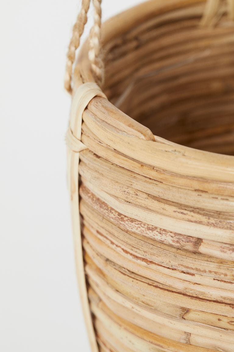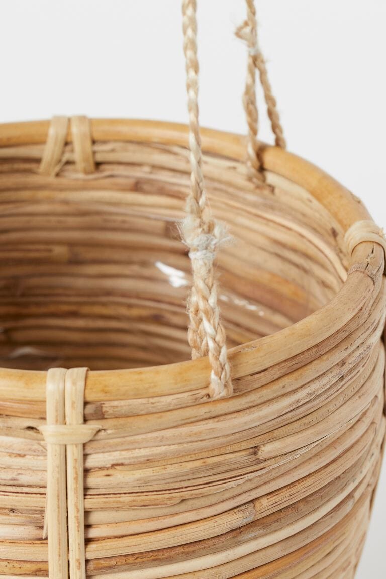En ampel i flettet rotting med tre snorer og metallring øverst.