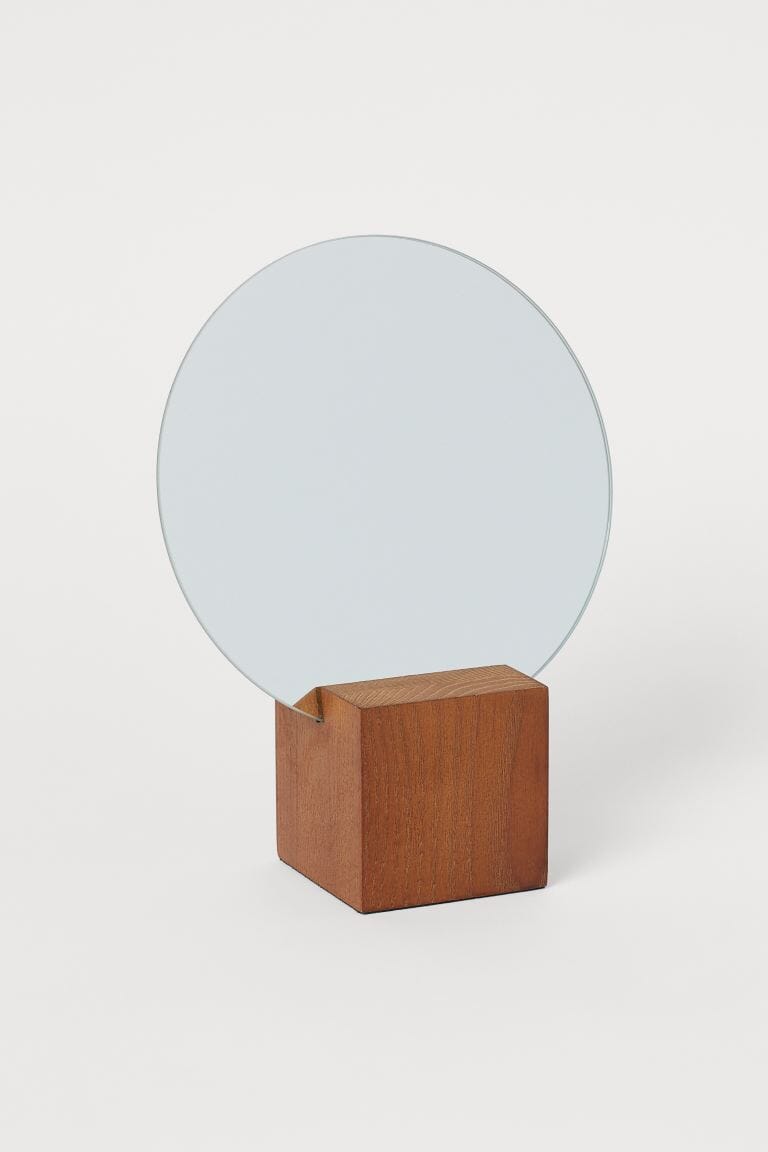 Speilet står på en kubeformet trefot. Diameter på speilet 18 cm. Størrelsen på foten 6,8x6,8 cm. Total høyde på produktet 22,5 cm.