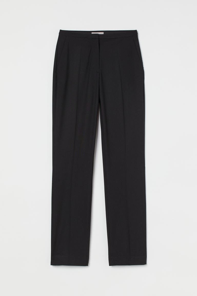 En elastisk bukse i vevd, viskoseblandet kvalitet. Høy midje med smal, trukket elastikk og gylf med glidelås og hekte.