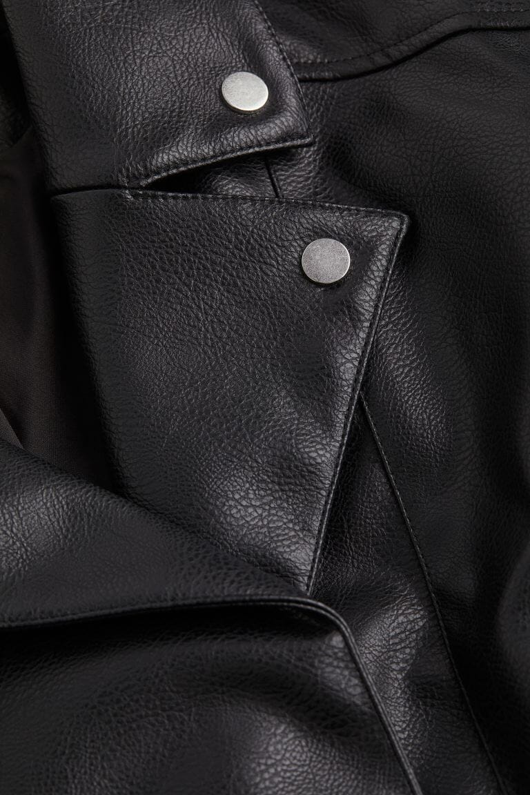 En kort bikerjakke i semsket skinnimitasjon med skråstilt glidelås foran og krage og slag med pynte-trykk-knapper.