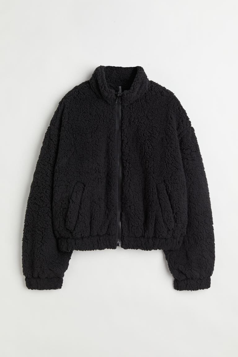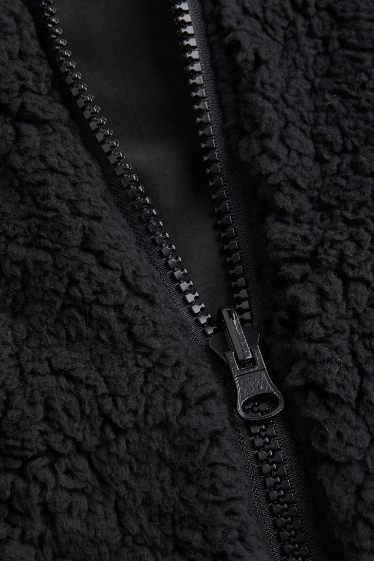 En jakke i myk pilé med høy krage og glidelås.