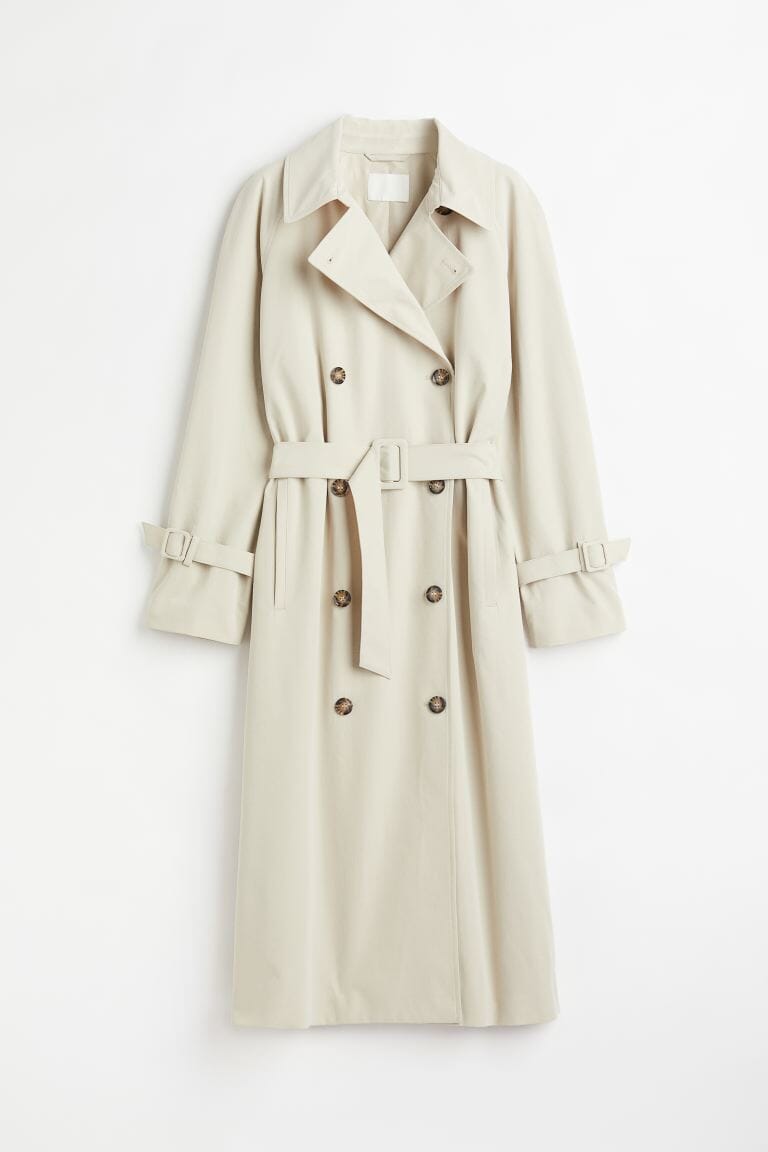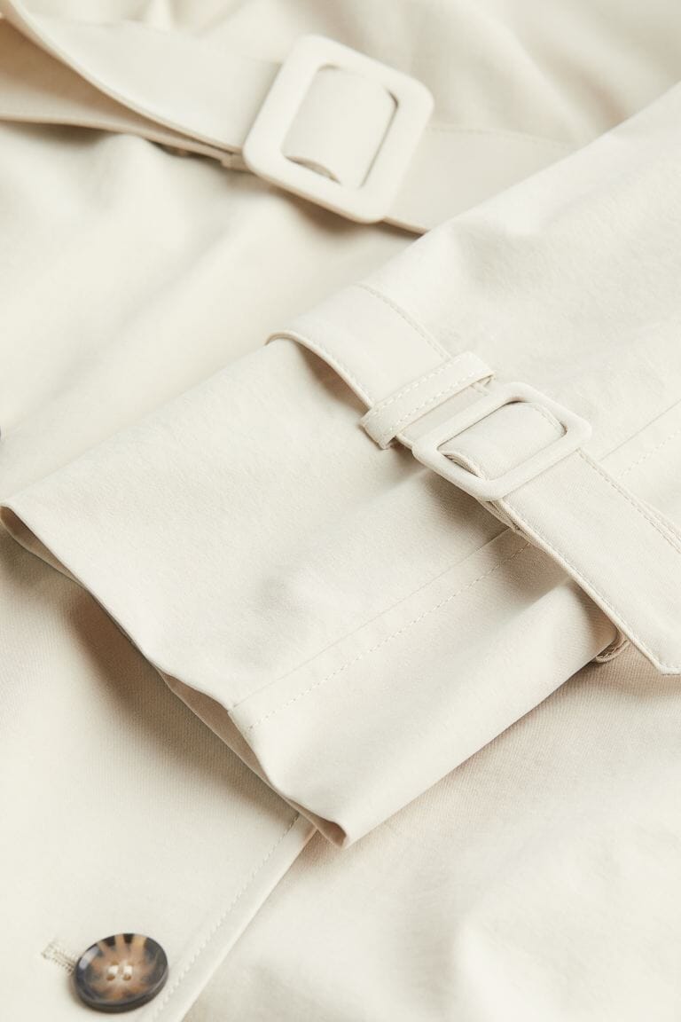 En dobbeltspent trenchcoat i vevd kvalitet med krage og slag.